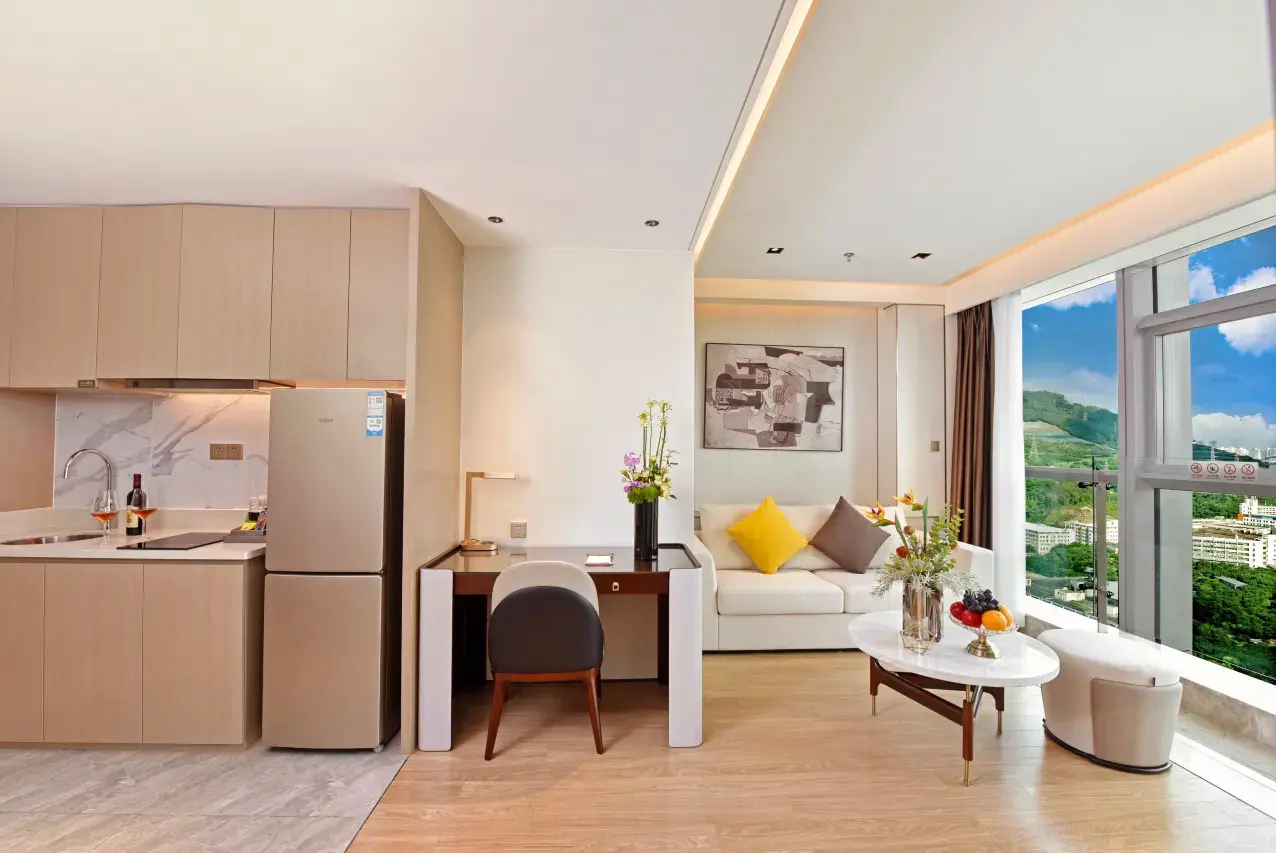 Welcome to the Deluxe Suite at Shenzhen Nanshan Jingfeng Hotel (Xili University Town Branch). Perfectly tailored for business professionals and couples, this 55㎡ suite offers a sophisticated blend of high-floor tranquility and modern residential convenience. Located between the 15th and 32nd floors of Tower B in the Zhongguan Shidai Plaza, the suite provides an elevated vantage point over the vibrant Nanshan District.